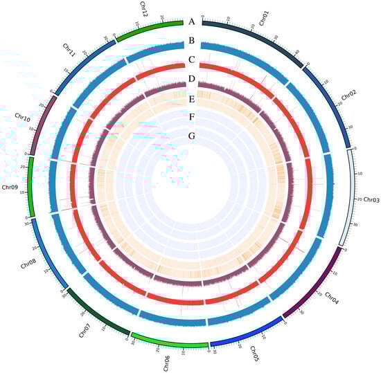 The temperature-sensitive two-line sterile line, 1892S, was employed for T2T (telomere-to-telomere) genome assembly. A total of 17.58 Gb (18,876,179,922 bp, ≥10,000 bp, approximately 43.95× coverage) of HiFi reads were generated using the PacBio platform, while 8.08 Gb (8,673,538,823 bp, ≥50,000 bp, approximately 20× coverage) ultra-long ONT reads were produced with the Oxford Nanopore Technology (ONT) platform. In the initial assembly stage, Hifiasm was employed to merge HiFi, ultra-long ONT reads, and Hi-C reads, a strategy that guaranteed the accuracy of the assembled genome. The assembled genome had a total size of 404,410,499 bp, with an N50 size of 31,773,460 bp and a GC content of 43.67%. Hi-C sequencing data was then integrated using the 3D-DNA and Juicer pipelines to facilitate the contigs into chromosomes. After refinement with Juicer-Box, the genome assembly was consolidated into 12 contigs, corresponding to the 12 chromosomes. To ensure a gap-free genome, we used ultra-long ONT reads to close residual gaps. The finalized assembly was compared to the Nipponbare T2T genome using MUMmer, confirming the accuracy of the chromosomes’ number [13] (Figure 1). This comprehensive assembly process successfully generated a high-quality, complete genome for 1892S, serving as a robust foundation for further genetic and functional analyses (Table 1).