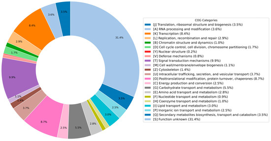 EggNOG-mapper was utilized to allocate COG categories, Gene Ontology (GO) categories, and KEGG pathway annotations to all annotated loci. In the EggNOG database, Orthologous Groups (OGs) serve as a proxy for gene families and are instrumental in functional annotation, classification, and evolutionary studies. Among the sequences analyzed, 41,939 mRNAs were successfully mapped to distinct eggNOG_OGs. The annotated genes were assigned putative functions according to the COG database, and these annotations were subsequently visualized using Python (Python 3.9) scripts (Figure 4).