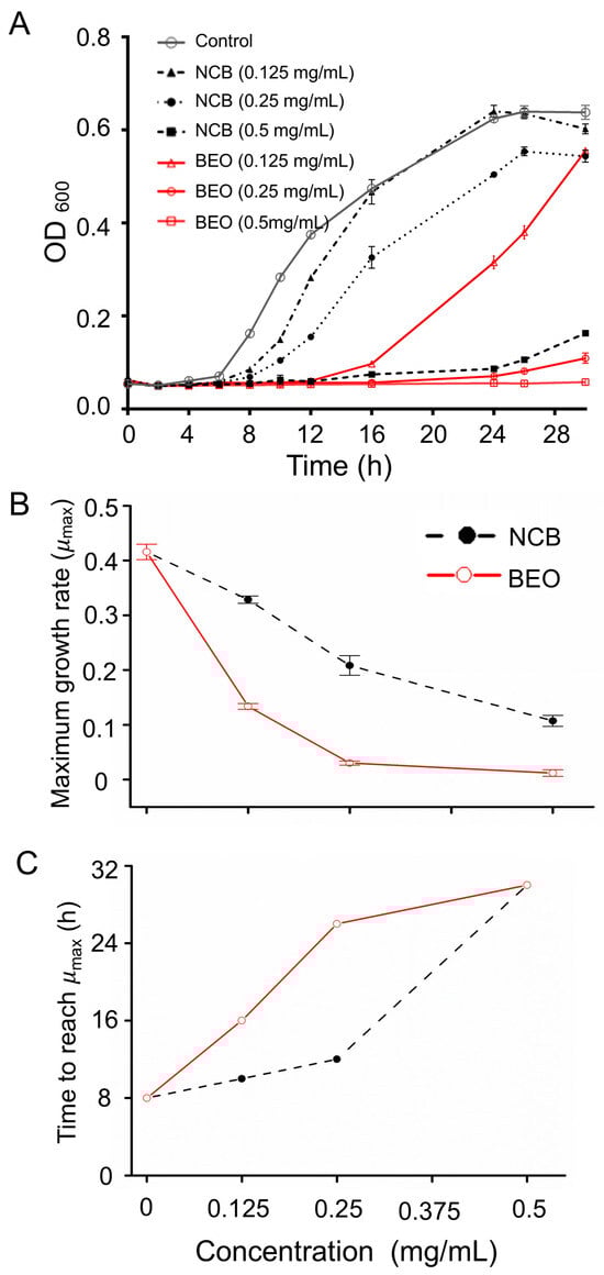 Effect of BEO and NCB on the cell growth of S. epidermidis. (A) Growth curves of S. epidermidis in the presence of different concentrations of BEO and NCB, determined from the optical density at 600 nm (OD600 nm). (B) Maximum growth rate (μmax) of S. epidermidis. (C) Culture time to reach the μmax of S. epidermidis. Data are presented as mean ± standard error of the mean (SEM) from three independent experiments (n = 3).