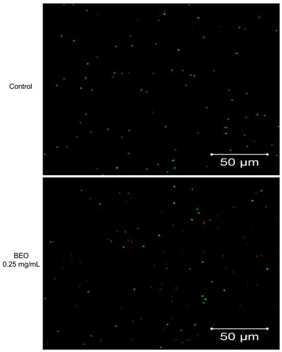 The increased red fluorescence suggests that BEO exerts its bactericidal effect primarily by compromising the bacterial membrane, a mechanism commonly observed for essential oils. Membrane disruption not only leads to leakage of cellular contents but also impairs vital processes such as respiration and nutrient transport, ultimately leading to bacterial death [21].