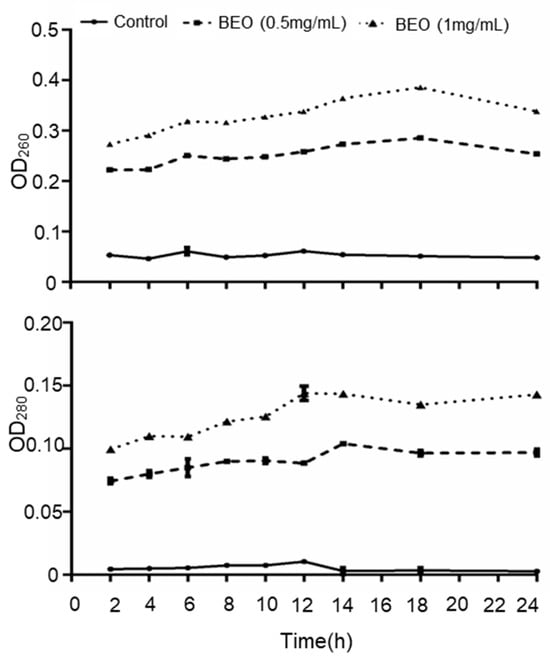 The cell membrane is an important structural component of bacteria. When the cell membrane is damaged, nucleic acids, proteins and other cytoplasmic contents leak out. Therefore, the leakage of intracellular substances is an important indicator of cell membrane integrity. Nucleic acids and protein have strong UV-absorption peaks at 260 and 280 nm, respectively, and measurement of these absorbances is a good indicator of cell membrane integrity [23]. In the untreated control, both absorbances were minimal and did not increase with time (Figure 3), whereas BEO treatment caused a marked increase in both absorbances, in a dose-dependent manner, indicating significant disruption of cell membrane integrity. Cinnamon essential oil [24] and Cudrania tricuspidata fruit essential oil [25] both exerted an antibacterial effect by disrupting cell membrane integrity, resulting in leakage of cytoplasmic nucleic acids and proteins.