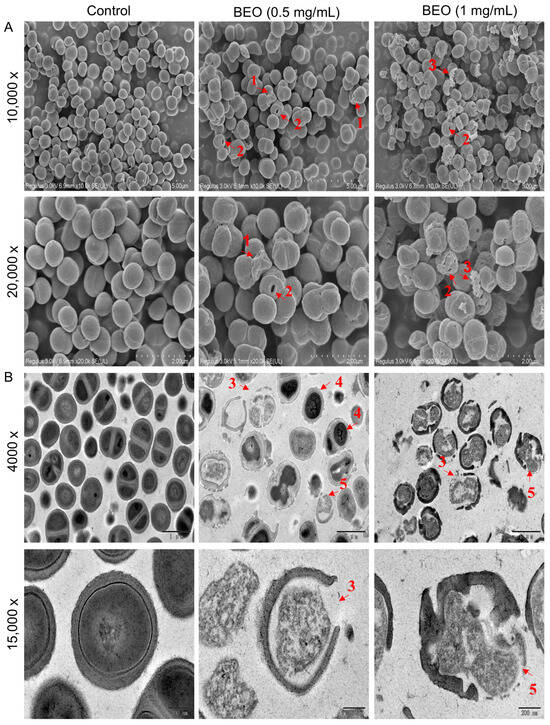 SEM and TEM observations were performed on the cells treated with BEO (Figure 4). The untreated control cells maintained a normal spherical structure with a smooth surface, whereas after BEO treatment at 0.5 and 1 mg/mL, the cell surface became rougher and some cells were shriveled, indicating perforation and collapse of the cell wall (Figure 4A, red arrows #1). Holes were visible on some cells (Figure 4A, red arrows #2). After BEO treatment at 1 mg/mL, some cells were ruptured and fragments of cell wall were visible (Figure 4A, red arrow #3). It appears that BEO caused various degrees of cell membrane damage ranging from minor surface irregularities to complete destruction. Similarly, the inhibitory effect of bifidocin A on E. coli appears to be related to the formation of pores in the cytoplasmic membrane [20]. In addition, the active components of essential oils appear to act by binding to the cell surface, then penetrating to target sites on the plasma membrane and membrane-bound enzymes, resulting in disruption of the cell structure [25].