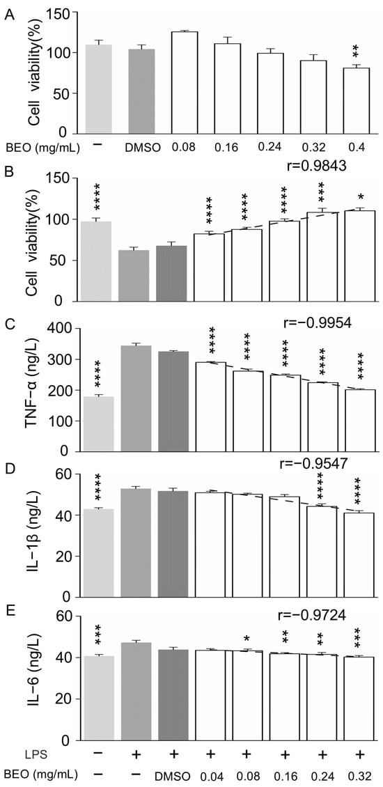 The effect of LPS-stimulation on cell viability was determined by Cell Counting Kit-8 measurements (Figure 5B). Viability significantly decreased in the LPS model cells, compared with control cells, which is consistent with a previous study [28]. BEO treatment significantly inhibited the LPS-induced decrease in cell viability, in a dose-dependent manner (r = 0.9843), indicating that BEO has a protective effect against cellular inflammatory damage caused by LPS.