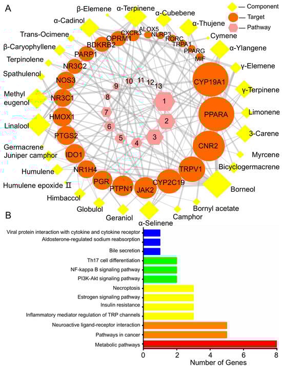 Inflammation pharmacology network of the “compounds–targets–pathways” regulated by BEO. (A) Anti-inflammatory network of the “components-targets-signaling pathways” regu-lated by BEO. Yellow rhomboidal nodes represent compounds, orange round nodes represent targets, and pink hexagonal nodes represent pathways. 1. Metabolic pathways; 2. Pathways in cancer; 3. Neuroactive ligand-receptor interaction; 4. Inflammatory mediator regulation of TRP channels; 5. Insulin resistance; 6. Estrogen signaling pathway; 7. Necroptosis; 8. PI3K-Akt signaling pathway; 9. NF-kappa B signaling pathway; 10. Th17 cell differentiation; 11. Bile secretion; 12. Aldosterone-regulated sodium reabsorption; 13. Viral protein interaction with cytokine and cytokine receptor. (B) The top 13 KEGG pathways associated with the enrichment of the therapeutic targets.