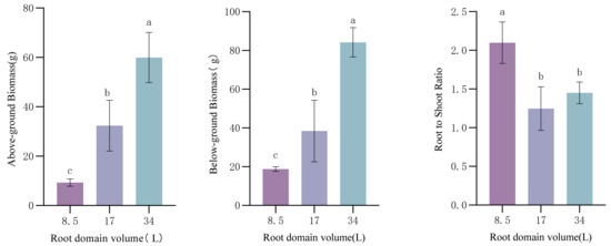 Effect of root-domain limitation on Paeonia ostii biomass. Different lowercase letters indicate significant differences in plant biomass in different root domain volume at 0.05 level.