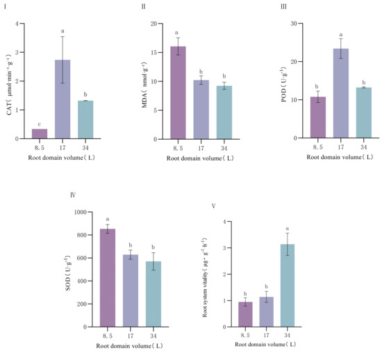Effect of root-domain restriction on the antioxidant system of P. ostii. (I) catalase (CAT); (II) malondialdehyde (MDA); (III) peroxidase (POD); (IV) superoxide dismutase (SOD); (V) Root system vitality. Different lowercase letters indicate significant differences in plant antioxidant system in different root domain volume at 0.05 level.
