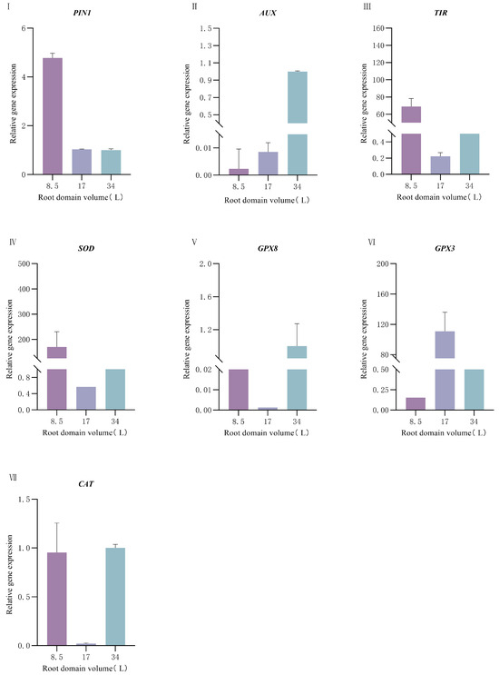 Effect of root-domain restriction on the expression of peony-related genes. (I) Relative gene expression of PIN1; (II) Relative gene expression of AUX; (III) Relative gene expression of TIR; (IV) Relative gene expression of SOD; (V) Relative gene expression of GPX8; (VI) Relative gene expression of GPX3; (VII) Relative gene expression of CAT.