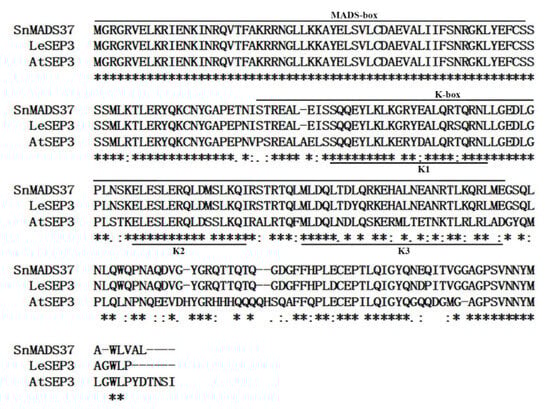 Sequence comparison between SnMADS37 and related MADS-box proteins. The deduced amino acid sequence aligned with the sequences of AtSEP3 (Arabidopsis) and LeSEP3 (tomato). The MADS-box and K-box domains are indicated by lines above, and the three sub-domains in the K-box, namely K1, K2, and K3, are underlined.