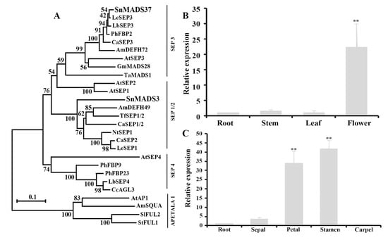 Phylogenetic analysis and quantitative RT-PCR analysis of SnMADS37. (A) SnMADS37 identified in this study with selected SEP-like genes. The tree was constructed using the neighbor-joining method using MEGA 11 software and the bootstrap values for 1000 replicates. (B) Relative expression analysis of SnMADS37 in the roots, leaves, stem, and early small inflorescence (Inflo); (C) Relative expression analysis of SnMADS37 in the sepal, petal, stamen, and carpel of earlier stage 1 in supplemental Figure S2. Asterisks indicate statistically significant differences (n = 3; ** p < 0.01).