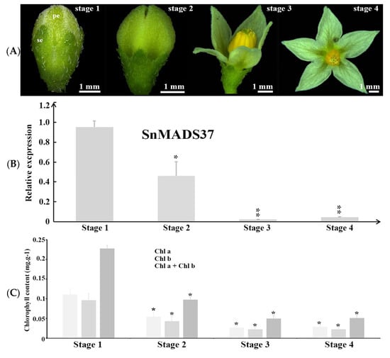Quantitative RT-PCR analysis of SnMADS37 in four developmental stages of wild type (WT) flowers. (A) Comparison of the shapes and chlorophyll colorations of the petals among four flower developmental stages. se: sepal; pe: petal. (B) Analysis of the relative expression of SnMADS37 in four flower developmental stages. (C) Chlorophyll content comparison among four flower developmental stages. Asterisks indicate statistically significant differences (n = 3; * p < 0.05; ** p < 0.01).