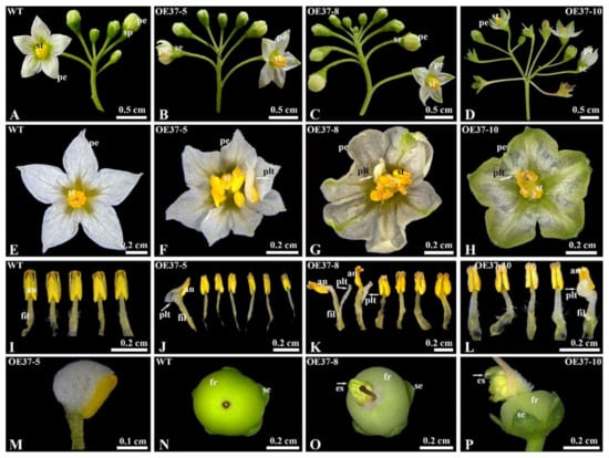 Flower phenotype comparison between WT and transformed S. nigrum plants grown in a climate chamber (25 °C, 16 h light condition). (A) Inflorescence of WT; (B) inflorescence of OE37-5; (C) inflorescence of OE37-8; (D) inflorescence of OE37-10; (E) flower of WT, showing five petals and stamens; (F) flower, showing seven petals and stamens; (G) flower, showing six petals and stamens; (H) flower, showing notable greenish petals; (I) five stamens of WT plant from panel (E); (J) seven stamens of the case in panel (F); (K) six stamens of the case in panel (G); (L) five stamens of the case in panel (H); (M) magnified petaloid anther of the case in panel (F); (N) WT fruit; (O) Extra organ developing transformed fruits of OE37-8; (P) Extra organ developing transformed fruits of OE37-10. The increased petal-like tissue in panels (F–H,J,K), and (L) formed an additional organ on the fruit in panels (O,P), which is indicated by the white arrow (se: sepal; pe: petal; st: stamen; fil: filament; an: anther; fr: fruit; plt: petal-like tissue, and es: extra shoot like organ).