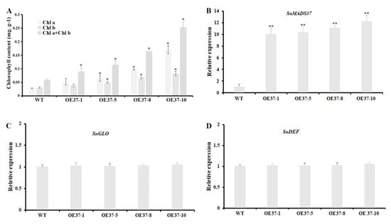 Comparison of chlorophyll content and relative expression analysis of B-function genes in fully opened stage 4 petals among a WT and four transgenic S. nigrum plants. (A) Analysis of the total chlorophyll content from petals of a WT and four transgenic plants; (B) SnMADS37 expression analysis from petals of a WT and four transgenic plants; (C) B-function gene SnGLO expression analysis from petals of a WT and four transgenic plants; (D) B-function gene SnDEF expression analysis from petals of a WT and four transgenic plants. OE37-1, 5, 8, and 10: four transformed plants with pBI-35S::SnMADS37. Asterisks indicate statistically significant differences between the WT and transgenic lines (n = 3; * p < 0.05; ** p < 0.01). Chl a: chlorophyll a; Chl b: chlorophyll b.