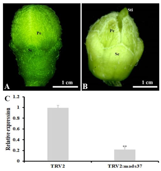 Comparison of phenotype between a control and an SnMADS37-silenced stage 1 floral bud of S. nigrum by VIGS treatment. (A) a control stage 1 floral bud treated with GV3101/TRV2; (B) an Snmads37-silenced stage 1 floral bud treated with GV3101/TRV2::Snmads37; (C) total RNA was extracted from stage 1 floral bud in (A) and (B), respectively, and relative expression of SnMADS37 was detected by qRT-PCR analysis. Asterisks indicate statistically significant differences (n = 3; ** p < 0.01). Se, sepal; Pe. petal; Sti, stigma.