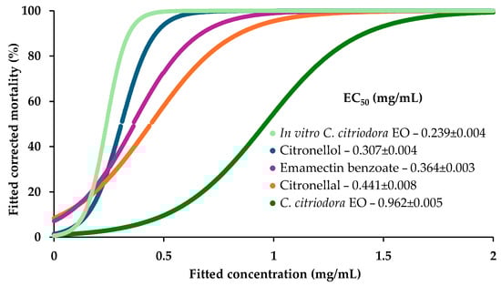The values of EC20 were higher for the C. citriodora EO (0.677 ± 0.003 mg/mL) followed by citronellol (0.209 ± 0.002 mg/mL), citronellal (0.186 ± 0.004 mg/mL), the in vitro C. citriodora shoot EO (0.174 ± 0.009 mg/mL) and, finally, emamectin benzoate (0.170 ± 0.006 mg/mL). For the EC80 values, the sequence from highest to lowest was C. citriodora EO > citronellal > emamectin benzoate > citronellol > in vitro C. citriodora shoot EO (Table 3). The values of EC100 were higher for emamectin benzoate (2.0), followed by C. citriodora EO (1.8), citronellal (1.7), citronellol (1.3), and lastly by in vitro C. citriodora shoot EO (0.9).