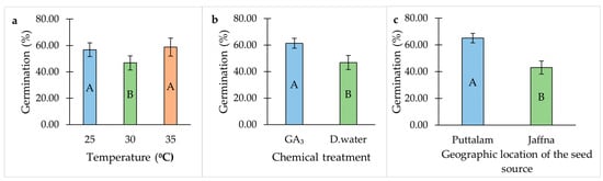 Seeds exhibited the highest GP at 25 °C and 35 °C, whereas the lowest germination was recorded at 30 °C (Table 1, Figure 1a). The application of gibberellic acid (GA3) significantly improved GP compared to the distilled water treatment (Table 1, Figure 1b). Furthermore, seeds collected from Puttalam district showed the highest GP compared to those from Jaffna district (Table 1, Figure 1c).