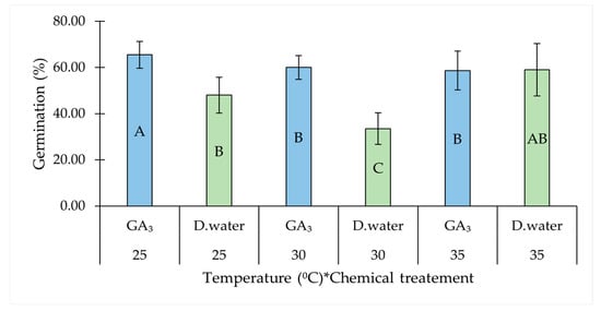 Among the two-way interactions, temperature and chemical treatment showed a notable interactive effect. GA3-treated seeds showed the highest GP at 25 °C, significantly improving germination compared to the control (with distilled water) at both 25 °C and 30 °C. However, this was not evident at 35 °C between GA3-treated and untreated seeds (Table 1, Figure 2).