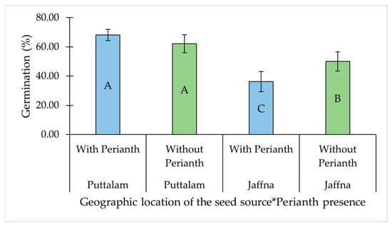 The other significant two-way interaction was observed between the perianth presence and geographic location of the seed source (Table 1). While perianth presence had no significant effect on GP in seed collected from Puttalam, its removal significantly improved germination in seeds collected from Jaffna (Table 1, Figure 3).