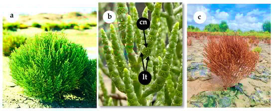 Various growth stages of Salicornia brachiata growing in their natural habitat (Puttalam, Sri Lanka). (a) Vegetative stage; (b) reproductive stage, showing the central flower (cn) and lateral flowers (lt); (c) senescence stage.
