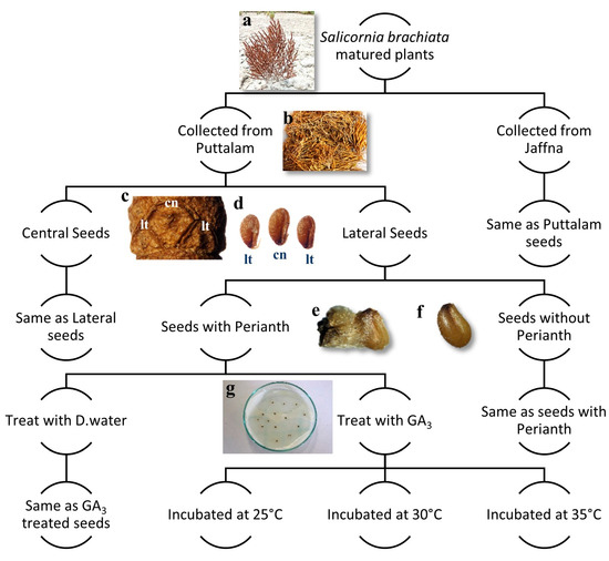 Schematic representation of the methodological workflow of seed germination experiment: (a) Matured and dried Salicornia brachiata plant in the seed senescence stage in their natural habitat; (b) collected shoot samples for seed extraction; (c) seed bearing dry cladode (stem piece) (cn) central seeds and (lt) lateral seeds; (d) central and lateral seeds detached from plant (perianth is also removed); (e) seed with the perianth segment attached; (f) seed without the perianth segment; (g) a prepared Petri dish after seed treatment.