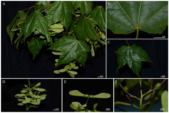 Morphological characters of Acer pubinerve of the Sapindaceae. (A) Leafy and fruiting branch; (B) leaf lower surface; (C) leaf upper surface; (D) infructescence; (E) samara displaying the two horizontal wings; (F) infructescence portion displaying the branching pattern. Photograph by Zhi Yang.