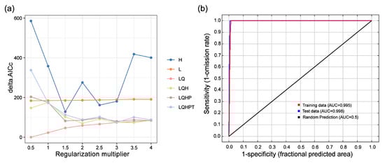 Model evaluation results (Delta.AICc and ROC curve) for Acer pubinerve: (a) Delta.AICc values corresponding to various combinations of feature classes and regularization parameters in the MaxEnt model; (b) ROC curve showing the performance of the MaxEnt model for Acer pubinerve. Note: the legend represents the feature class types-L: Linear, Q: Quadratic, H: Hinge, P: Product, and T: Threshold.