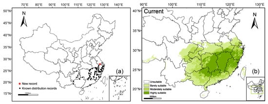 Acer of the Sapindaceae is primarily distributed across the northern temperate zone. Some species of the genus are well-known for their highly ornamental value, e.g., Acer buergerianum, A. pictum subsp. mono, and A. wilsonii, while some others are used for different purposes, i.e., maple syrup of A. saccharum and timber for furniture [16,17,18]. Acer pubinerve is a subtropical tree species endemic to China. It is a deciduous tree, is 7–10 m tall, dark gray, with smooth bark, opposite five-lobed leaves, and horizontally spreading winged fruits. It is mainly found in sparse forests at elevations of 500–1200 m in Zhejiang, northern Fujian, southern Anhui, and eastern Jiangxi [19,20,21]. It is a valuable hardwood because of its straight grain, hard texture, fine structure, and erosion-resisting heartwood. The species is also a high-quality ornamental and landscaping tree because of its elegant shape and golden-yellow foliage in autumn, possessing significant ecological and economic value [22]. Although previous studies have modeled the suitable habitats of closely related species such as A. truncatum, A. cordatum, and A. poliophyllum [23,24,25], there is still a lack of systematic research on the resource distribution and suitable habitats of A. pubinerve. In May 2023, we conducted a native plant survey on the Xishan Island in Suzhou, Jiangsu province, and discovered a wild population of A. pubinerve Rehder near Tianwangwu village (Figure 1). We determined the species based on careful examination of morphological characters, type specimen (E. Faber 203) and the relevant literature [26]. This represents the first confirmed record of A. pubinerve in Jiangsu and also constitutes the northernmost known occurrence (31.12° N, 120.28° E). This finding extends the known range of the species in the north, because neither the Flora of Jiangsu nor the ‘Catalogue of Life China 2024 Annual Checklist’ included Jiangsu in the statement of its distribution [27]. It is interesting to know how this new distribution record impacts on our knowledge of the species’ ecological niche and potential habitat under climate change.