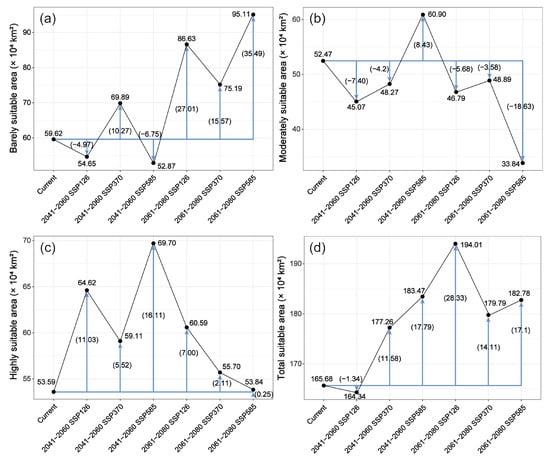 The suitable area of Acer pubinerve under current and future climate scenarios. (a) Barely suitable area; (b) Moderately suitable area; (c) Highly suitable area; (d) Total suitable area. Black lines show absolute area changes across time periods and SSPs (×104 km2); blue arrows indicate changes relative to the current period, with values in brackets.