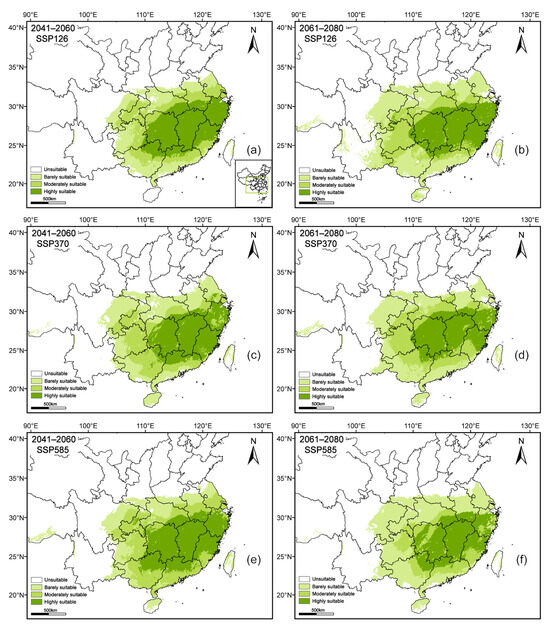 The spatial distribution maps further indicated that under future climate change, the suitable habitats would remain primarily concentrated in provinces such as Jiangxi, Zhejiang, Fujian, and Hunan, with highly suitable areas showing a tendency to expand northward and westward (Figure 5). In addition, under the SSP585 scenario during 2061–2080, the highly suitable habitats exhibited a trend of fragmentation, with a reduction in moderately to highly suitable areas and an increase in the proportion of barely suitable areas.