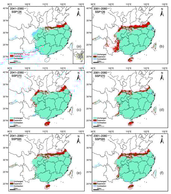 Spatial dynamics of Acer pubinerve under different future climate scenarios. Note: different letters indicate different future climate scenarios: (a) SSP126 2041–2060; (b) SSP126 2061–2080; (c) SSP370 2041–2060; (d) SSP370 2061–2080; (e) SSP585 2041–2060; (f) SSP585 2061–2080.