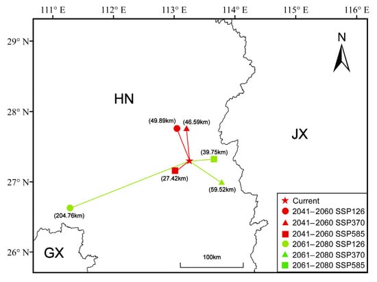 Centroid migration of Acer pubinerve under future climate change scenarios. HN: Hunan province; GX: Guangxi province; JX: Jiangxi province.
