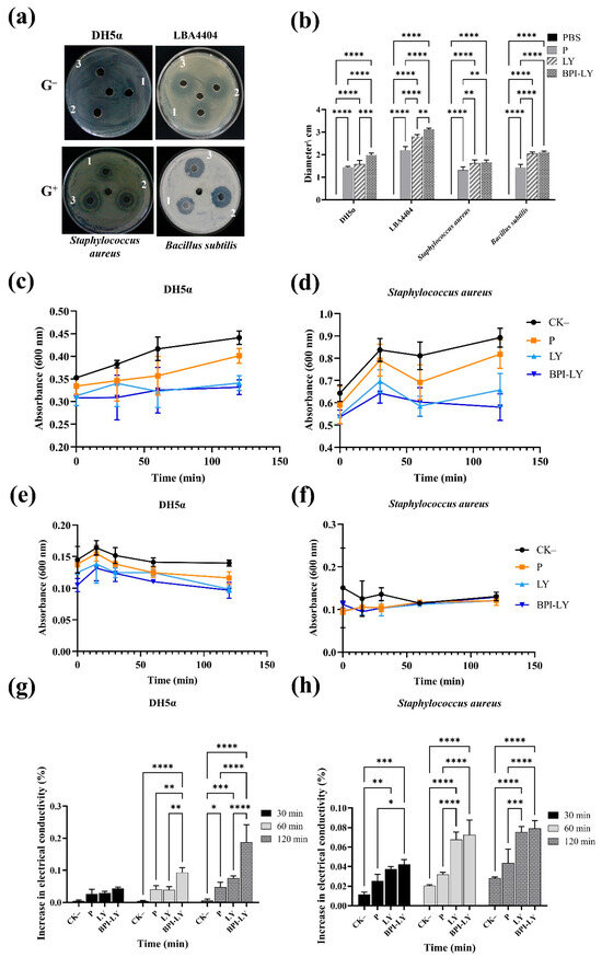 Antimicrobial activity of antimicrobial proteins in vitro. (a) Agar well diffusion test results. The middle hole represents PBS; 1: protein supernatant from empty vector P; 2: protein supernatant from LY; 3: protein supernatant from BPI-LY. The Gram-negative (G−) bacteria are Escherichia coli strain DH5α and Agrobacterium tumefaciens strain LBA4404. The Gram-positive (G+) bacteria are Staphylococcus aureus and Bacillus subtilis. (b) Antibacterial statistics of the agar plate. (c) Effect on the growth curve of DH5α. (d) Effect on the growth curve of S. aureus. (e) Effect on the bactericidal curve of DH5α. (f) Effect on the bactericidal curve of S. aureus. (g) Effect on the conductivity of DH5α. (h) Effect on the conductivity of S. aureus. All experiments were set up in triplicate and repeated three times. The results are expressed as the mean ± standard deviation, and statistical analysis was conducted using two-way ANOVA; α = 0.05, * p < 0.05, ** p < 0.01, *** p < 0.001, **** p < 0.0001.
