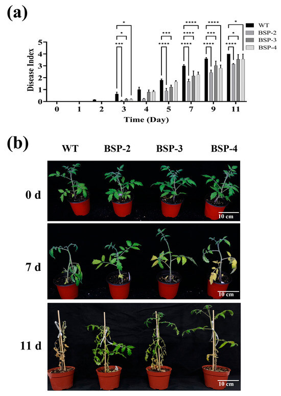 Phenotype and disease index of tomato after inoculation with Ralstonia solanacearum. (a) Disease indices for different growing days. Results are expressed as the mean ± standard deviation, and statistical analysis was performed using two-way ANOVA; α = 0.05, * p < 0.05, *** p < 0.001, **** p < 0.0001. (b) Comparison of seedling growth before and 7 and 11 days after inoculation; 0 d: Before inoculation; 7 d: inoculation for 7 days; 11 d: inoculation for 11 days. Note: WT: wild type; BSP-2, BSP-3, and BSP-4: T2 homozygous line offspring corresponding to the high sp-BPI-LY expression lines in the T0 generation. Every 10 seedlings constituted a group, and the experiment was repeated three times.