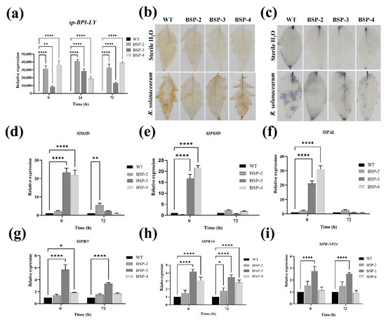 Effect of sp-BPI-LY overexpression on the ROS accumulation and the expression of defense enzyme-related genes and pathogenesis-related genes in tomato. (a) sp-BPI-LY gene expression levels in leaves of different transgenic tomato lines at different times. (b) DAB staining. WT represents the wild type; BSP-2, BSP-3, and BSP-4 represent the transgenic lines positive for sp-BPI-LY expression; sterile H2O is the control; and R. solanacearum is the disease causal agent; this is the same below. (c) NBT staining. (d) SlSOD gene expression. (e) SlPOD gene expression. (f) SlPAL gene expression. (g) SlPR5 gene expression. (h) SlPR10 gene expression. (i) SlPR-NP24 gene expression. Results are expressed as the mean ± standard deviation, and the statistical analysis was performed using two-way ANOVA; α = 0.05, * p < 0.05, ** p < 0.01, **** p < 0.0001. The experimental parts of (b,c) used three biological replicates, and the experimental parts of (a,d–i) used three biological replicates and were repeated three times.