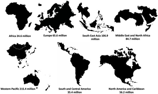 According to the International Diabetes Federation (IDF), there are 588.7 million adults living with diabetes, with the Western Pacific accounting for the highest number, and Africa the lowest (Figure 1) [6]. This number has been estimated to increase to 783 and 852.5 million by 2045 and 2050, respectively [6]. The IDF further accorded 3.4 million deaths in 2021 to diabetes [6]. Of all diabetes types, type 2 diabetes (T2D) accounts for over 90% of these cases.