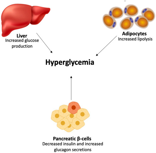 Insulin resistance results in elevated hepatic glucagon levels and intensified hepatic glucagon responsiveness, prompting the liver to produce excessive glucose [21], thereby contributing to the onset of hyperglycemia in T2D (Figure 2). Insulin resistance also leads to a higher rate of lipolysis in the adipocytes, resulting in increased FFA plasma levels, which in turn exacerbate insulin resistance in the liver and muscle and contribute to the failure of pancreatic β-cells, ultimately causing hyperglycemia [21].