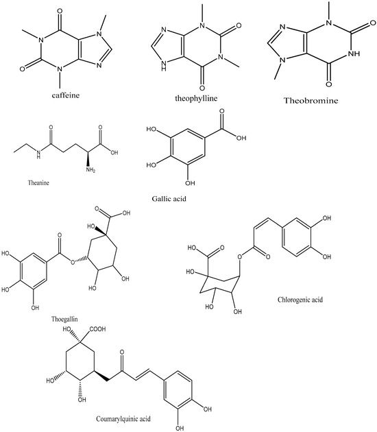 Dried tea leaves are manufactured from fresh tea leaves obtained from the C. sinensis plant, which is responsible for producing various types of tea. The main ingredients in fresh tea leaves are proteins and carbohydrates like cellulose [47]. High concentrations of these enzymes are crucial for the digestion of black tea since they are accountable for catechin oxidation and are included in the protein component [48]. Another important element is l-theanine, the primary amino acid found in tea leaves and a N-methylated derivative of glutamine [33]. Fresh tea leaves contain caffeine and other methylxanthines, along with trace amounts of theobromine and theophylline (Figure 3) [49].