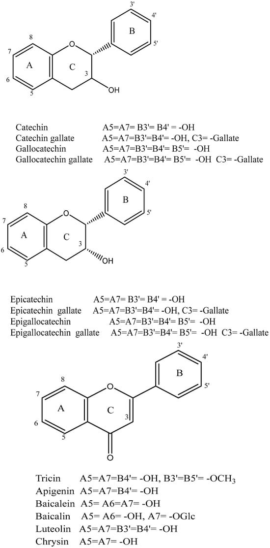 Catechins are the main polyphenols found in fresh tea. The major catechins are the four (–)-stereoisomeric forms, (−)-epicatechin (EC), (−)-epigallocatechin (EGC), epicatechin gallate (ECG), and (−)-epigallocatechin gallate (EGCG). Fresh tea leaves also contain the (+)-stereoisomeric forms, such as (+)-gallocatechin (GC) and (+)-catechin (C), albeit in much lower amounts (Figure 4) [52]. Several studies have reported EGCG as the most prevalent catechin in fresh tea leaves [53]. These studies ranked the quantities of the various catechins as EGCG > EGC > ECG > EC > C. The levels of catechins can vary based on factors such as harvesting season, leaf age, harvesting technique, tea plant type, and cultivar [52].