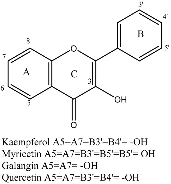 Polyphenol is the other essential component found in tea leaves. In addition to catechins (flavan-3-ols) and proanthocyanidins, which are catechin dimers and oligomers, the principal class of polyphenols found in fresh tea leaves is known as flavanols [50]. Other polyphenol families, including flavonols and flavones, are also present, albeit in much lesser quantities [33]. The flavonols kaempferol, quercetin, and myricetin, (Figure 4) as well as their glycosides, are present in fresh tea leaves. Apigenin is a flavone.
