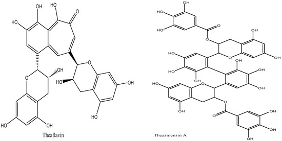 The primary chemical modification that occurs during the preparation of black tea is the oxidation of catechins to create thearubigins and theaflavin. Upon cell destruction, previously separated catechin in the cytoplasm, chloroplast PPO, and cell wall peroxidase come into contact, resulting in catechin oxidation and theaflavin formation [63]. Catechins undergo significant oxidation during fermentation, which leads to the formation of theaflavins [64]. The primary theaflavins present in black tea are theaflavin, theaflavin 3-gallate, theaflavin 3′-gallate, and theaflavin 3,3′-gallate [65]. Theaflavins are the oxidized dimers of catechin monomers.