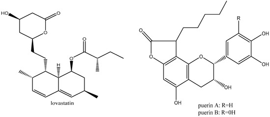 The key bioactive compound found in pu-erh tea is theabrownin, a dark brown coloring that appears in dark tea varieties [72]. Theabrownins also have unidentified chemical structures, although spectroscopic study has shown that they are complicated molecules made up of lipids, phenols, proteins, flavonoids, and carbohydrates [73]. According to research by Zhang et al. [74], theabrownins are produced as a result of catechin degradation and oxidation. Finally, some new compounds have been identified in dark tea. These compounds comprise of effective HMG-CoA reductase inhibitors like puerins and lovastatin (Figure 6), which both significantly lower the amount of LDL cholesterol in the body [74].