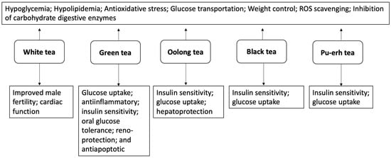 A literature search was carried out on “PubMed”, “Google Scholar”, and “ScienceDirect”, with the aim of identifying peer-reviewed published (mostly studies from 2010 and beyond) data reporting the antidiabetic, antilipidemic, and digestive enzyme inhibitory effects of the selected tea types. The keywords comprised a mixture of the name (either common or scientific) of the tea and the corresponding bioactivity. The search results were carefully chosen to align with the focus of this review. An analysis of the selected studies was conducted to identify the phytochemical properties and antidiabetic mechanisms of the different teas.