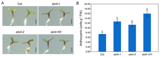 Anthocyanin accumulation in wild-type, abi4-1, abi4-2, and abi4-101 mutants. (A) Representative phenotypes of wild-;-type (Col) and abi4 mutant seedlings (abi4-1, abi4-2, and abi4-101) grown on 1/2 MS medium for 4 days. Scale bar = 1 mm. (B) Anthocyanin content in wild-type (Col) and abi4 mutants (abi4-1, abi4-2, and abi4-101) grown on 1/2 MS medium for 4 days. One-way analysis of variance (ANOVA) with Duncan’s test was used to obtain significant variations. The different lowercase letters indicate significant differences among the samples at p < 0.05, n = 3.