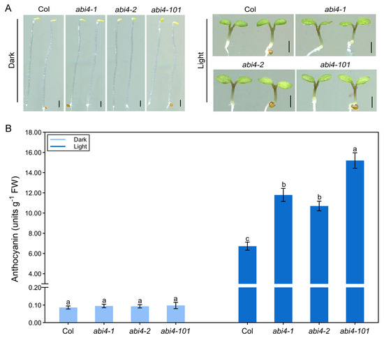 Anthocyanin levels in wild-type and abi4 mutant seedlings grown under dark and light conditions. (A) Representative phenotypes of wild-type (Col) and abi4 mutants (abi4-1, abi4-2, and abi4-101) grown under dark or light conditions for 4 days. Scale bar = 1 mm. (B) Anthocyanin content in wild-type (Col) and abi4 mutants grown under dark or light conditions for 4 days. One-way analysis of variance (ANOVA) with Duncan’s test was used to obtain significant variations. The different lowercase letters indicate significant differences among the samples at p < 0.05, n = 3.