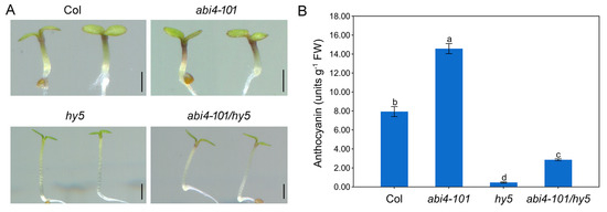 Anthocyanin accumulation in wild-type, single mutants of abi4-101 and hy5, and the abi4-101/hy5 double mutant. (A) Representative phenotypes of wild-type (Col), single mutants (abi4-101 and hy5), and the double mutant (abi4-101/hy5) grown on 1/2 MS medium for 4 days. Scale bar = 1 mm. (B) Anthocyanin content in wild-type (Col), single mutants (abi4-101 and hy5), and the double mutant (abi4-101/hy5) grown on 1/2 MS medium for 4 days. One-way analysis of variance (ANOVA) with Duncan’s test was used to obtain significant variations. The different lowercase letters indicate significant differences among the samples at p < 0.05, n = 3.