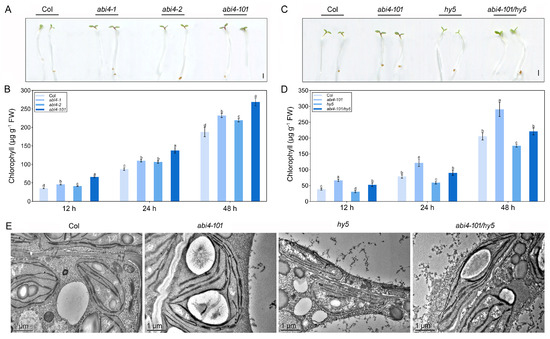 Photosynthetic development of wild-type, single mutants of abi4-101 and hy5, and the abi4-101/hy5 double mutant. (A) Representative phenotypes and (B) chlorophyll content of wild-type (Col) and abi4 mutants (abi4-1, abi4-2, and abi4-101) grown in darkness for 4 days followed by continuous light exposure for 12–48 h. (C) Representative phenotypes, (D) chlorophyll content, and (E) chloroplast ultrastructure of wild-type (Col), single mutants (abi4-101 and hy5), and the double mutant (abi4-101/hy5) grown for 4 days in darkness followed by continuous expose to light for 12–48 h. One-way analysis of variance (ANOVA) with Duncan’s test was used to obtain significant variations. The different lowercase letters indicate significant differences among the samples at p < 0.05, n = 3.