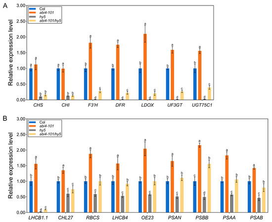 Expression levels of the key genes involved in anthocyanin biosynthesis and photosynthesis. (A) Transcript levels of anthocyanin biosynthetic structural genes in wild-type (Col), single mutants (abi4-101 and hy5), and the double mutant (abi4-101/hy5). (B) Transcript levels of photosynthesis-related genes in the wild-type (Col), single mutants (abi4-101 and hy5), and double mutant (abi4-101/hy5). One-way analysis of variance (ANOVA) with Duncan’s test was used to obtain significant variations. The different lowercase letters indicate significant differences among the samples at p < 0.05, n = 3.