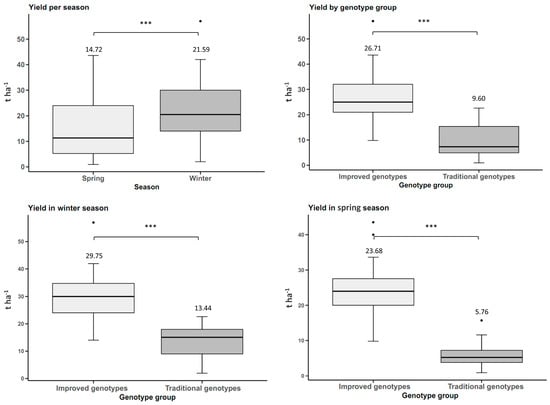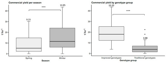 Yield of commercial sweet potato tuberous roots (n = 20 cultivars × 5 replicates) by planting season and by genotype group (improved and traditional). *** p < 0.001.