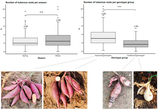 Number of sweet potato tuberous roots (n = 20 cultivars × 5 replicates) by planting season and by genotype group. n.s.: not significant; *** p < 0.001.