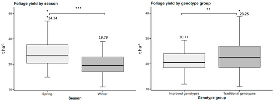 Foliage yield was 4.45 t ha−1 higher in spring than in winter, with statistically significant differences. Traditional genotypes had a higher foliage yield of 2.48 t ha−1 than improved genotypes, with statistically significant differences (Figure 4).