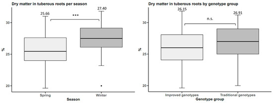Dry matter in tuberous roots was higher in winter, with an average dry matter content of 27.40%, 1.84% higher than in spring. However, there were no statistically significant differences between the genotype groups (Figure 5).